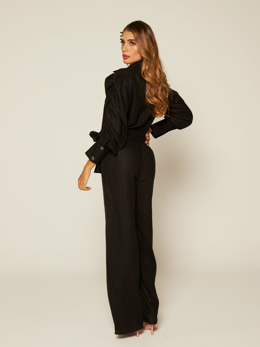 Classic linen tie-belt jumpsuit with balloon sleeves. The belt is 100 % organic linen and can be tied to the front, side or back.